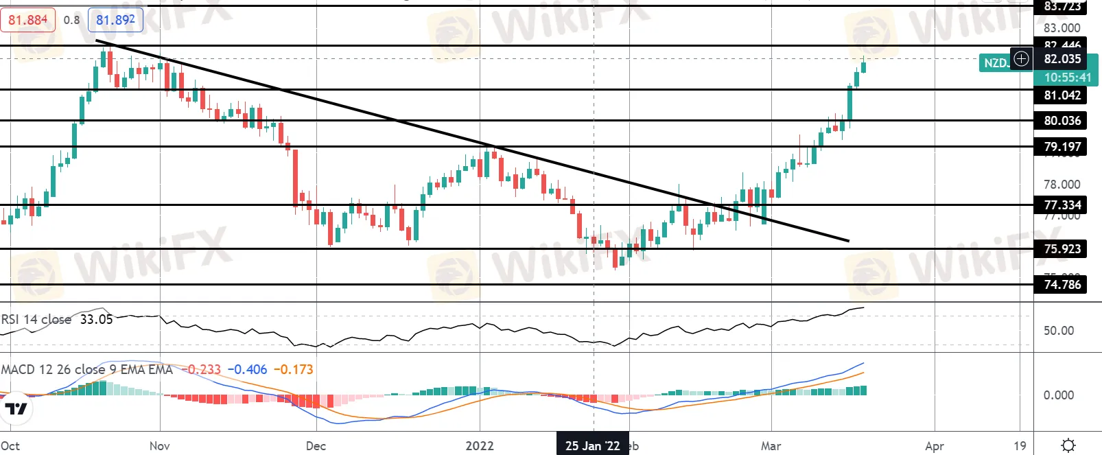 从 2021 年高点突破看跌趋势线继续进一步发展。价格在最近的上涨中突破了几个关键阻力位,并且随着 MACD 和 RSI 看涨,近期关注的焦点是进一步上涨。上行方面,下一个重大挑战将是 82.44 附近的 2021 年高点。如果我们看到一个干净的突破,焦点将转移到 83.72 作为下一个上行标记。