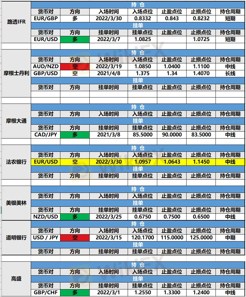持仓方面,法农银行欧元兑美元仓位调整,止损点位由1.1250调整至1.1450,目前处于持仓中。