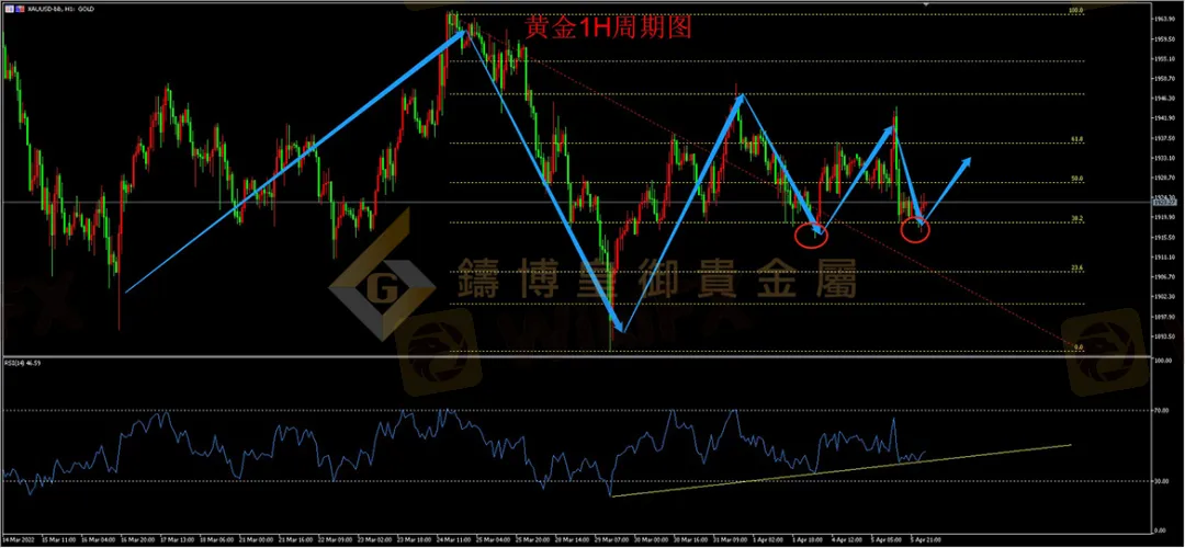 从下方的黄金1H周期图来看,黄金昨日经历整个亚盘时段的震荡后,在1924一线获得支撑并迅速拉升,但晚间由于消息面影响,在1944一线迅速冲高回落,并跌破多个短线支撑,今日在1918一线重要支撑企稳,短线来看,黄金仍处于震荡区间之中,下方1918一线支撑较为关键,另外1H的RSI向上趋势线支撑完好,有反弹信号产生,如果今日回落下方支撑,可轻仓尝试做多。