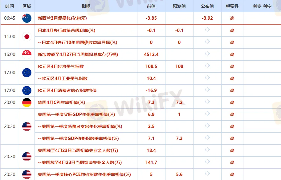 周三(4月27日)美元指数连涨五日,刷新逾五年高点至103.28,预计美联储下周将宣布加息,欧元因经济忧虑而走软,此前俄罗斯切断了对两个东欧国家的天然气供应。现货黄金跌超1%,创2月24日以来新低至1881.20美元/盎司,市场预期美联储将大幅收紧货币政策,这令金价承压。美油小幅上涨,EIA报告显示美国上周汽油和精炼油库存下降,提振了油价。