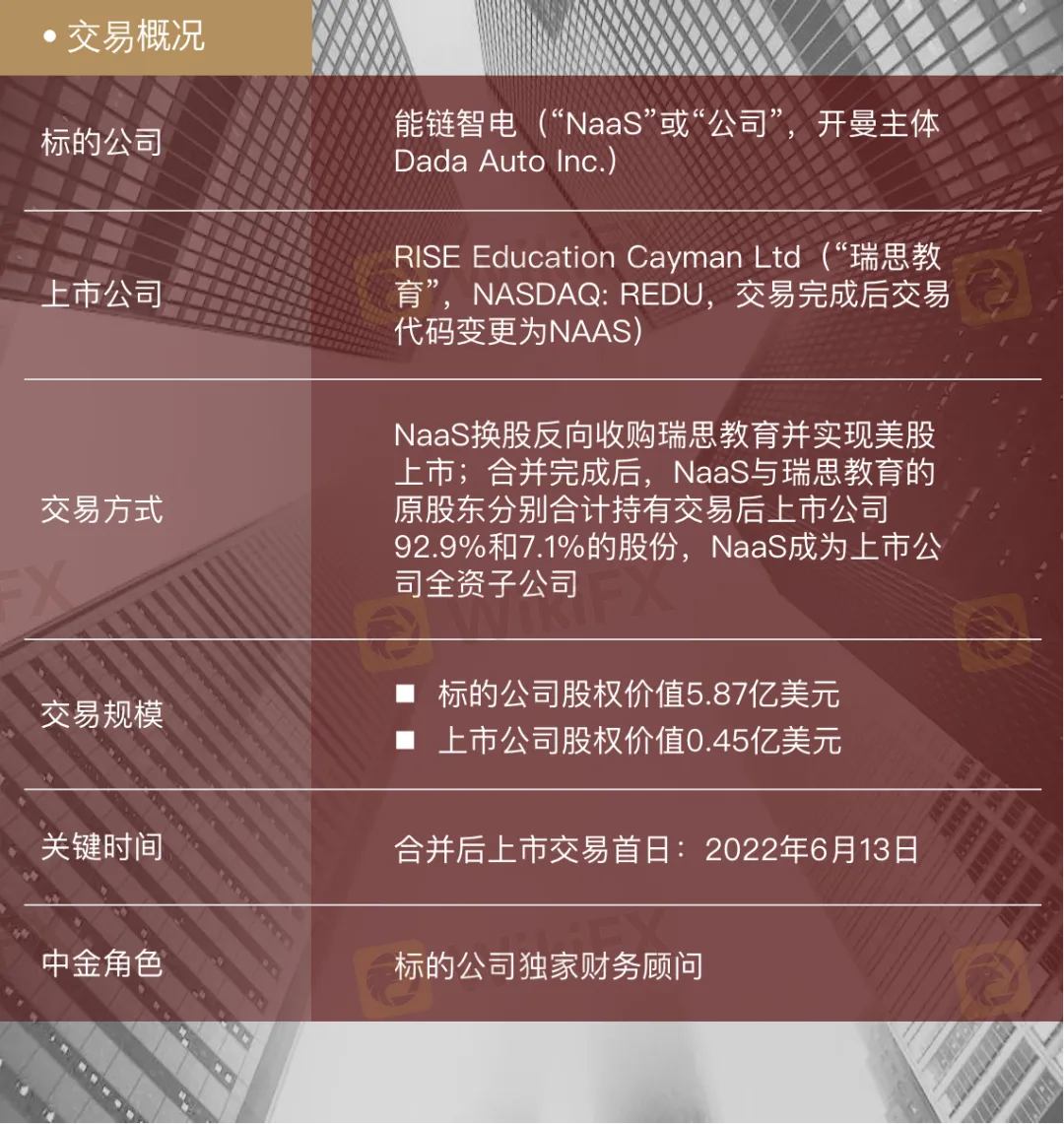 能链智电(NaaS或“公司”,开曼主体Dada Auto Inc.)于2022年6月13日(美东时间)完成换股反向收购美股上市公司RISE Education Cayman Ltd(“瑞思教育”,NASDAQ: REDU)并实现美股上市(“本次交易”),上市公司交易代码变更为NAAS。中金公司在本次交易中担任NaaS独家财务顾问。