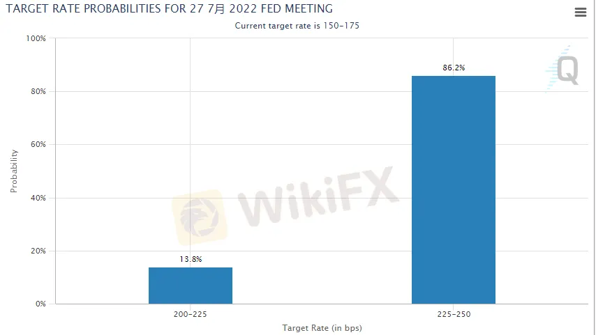 从目前市场的预期来看,交易员押注下个月加息75个基点的概率更高。芝商所的美联储观察(Fed Watch)工具显示,美联储在下月加息75个基点的概率目前为86.2%,而加息50个基点的概率仅为13.8%。