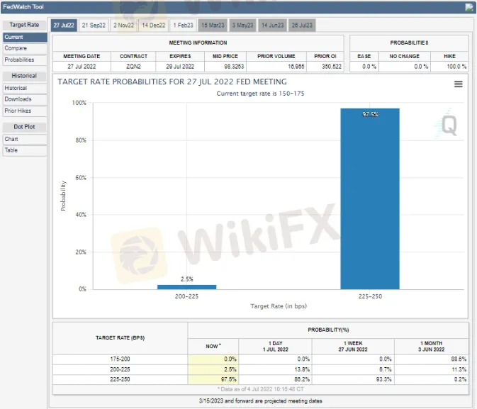 由于高居不下的通胀,美联储在今年开启了激进加息之路,并开始缩表,美债收益率持续上涨,提振了美元。虽然自6月中旬以来,美国10年期债券收益率持续回落,但实际收益率却没有下跌。根据CME的美联储观察工具FEDWatch显示,美联储在下次会议上再次加息75个基点的概率高达97.5%。