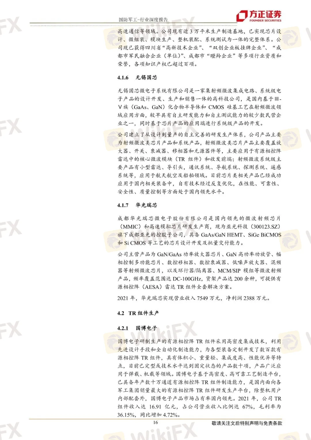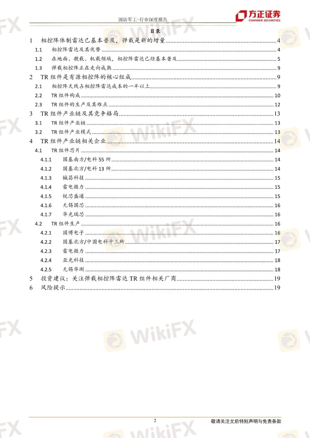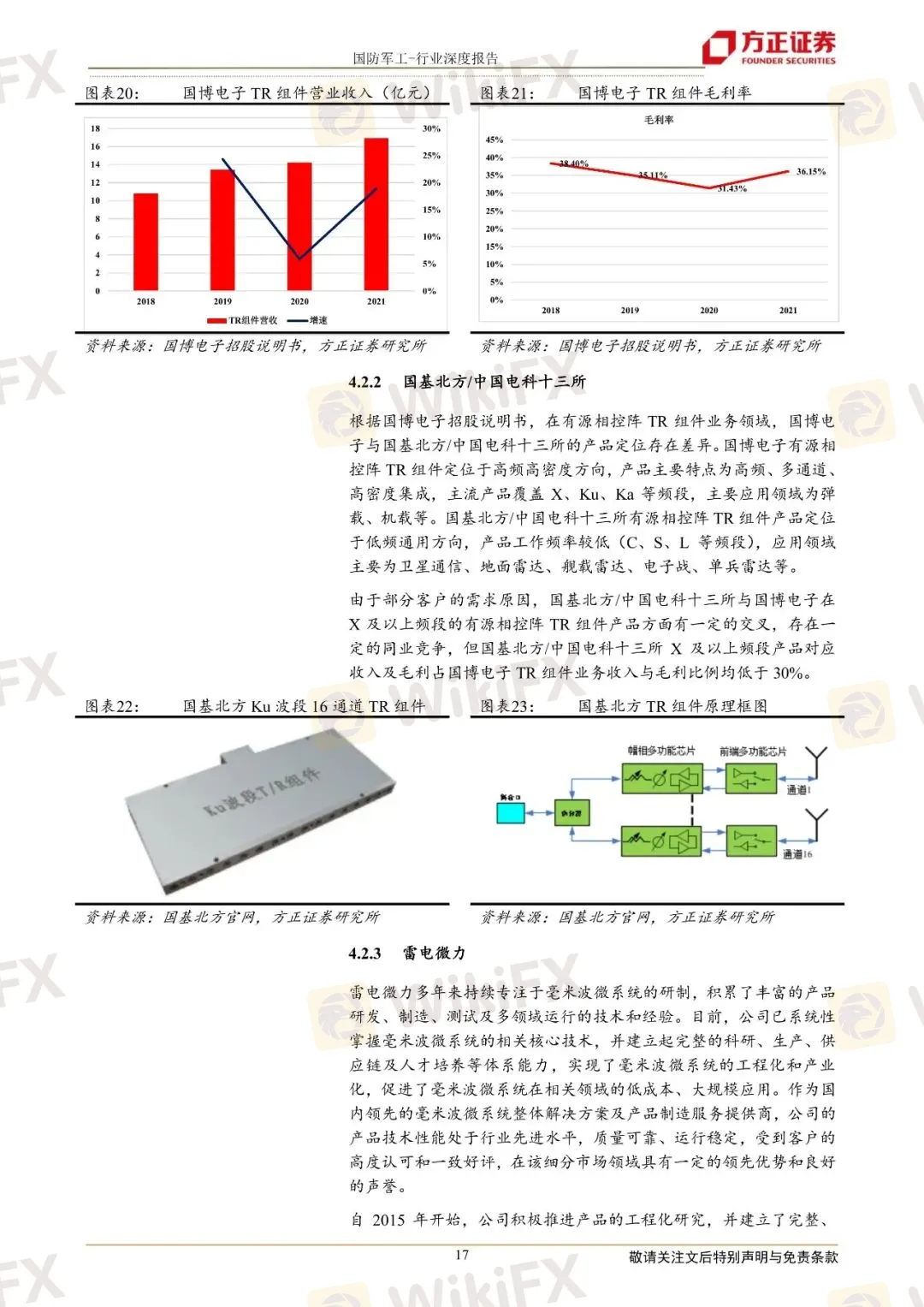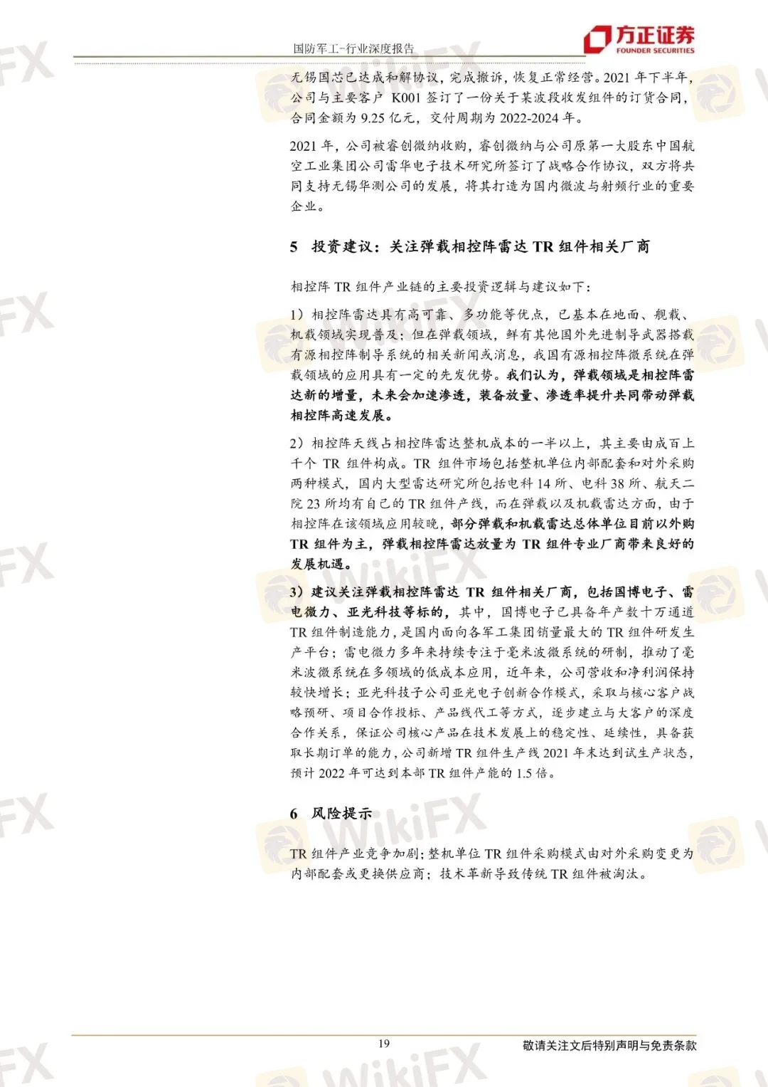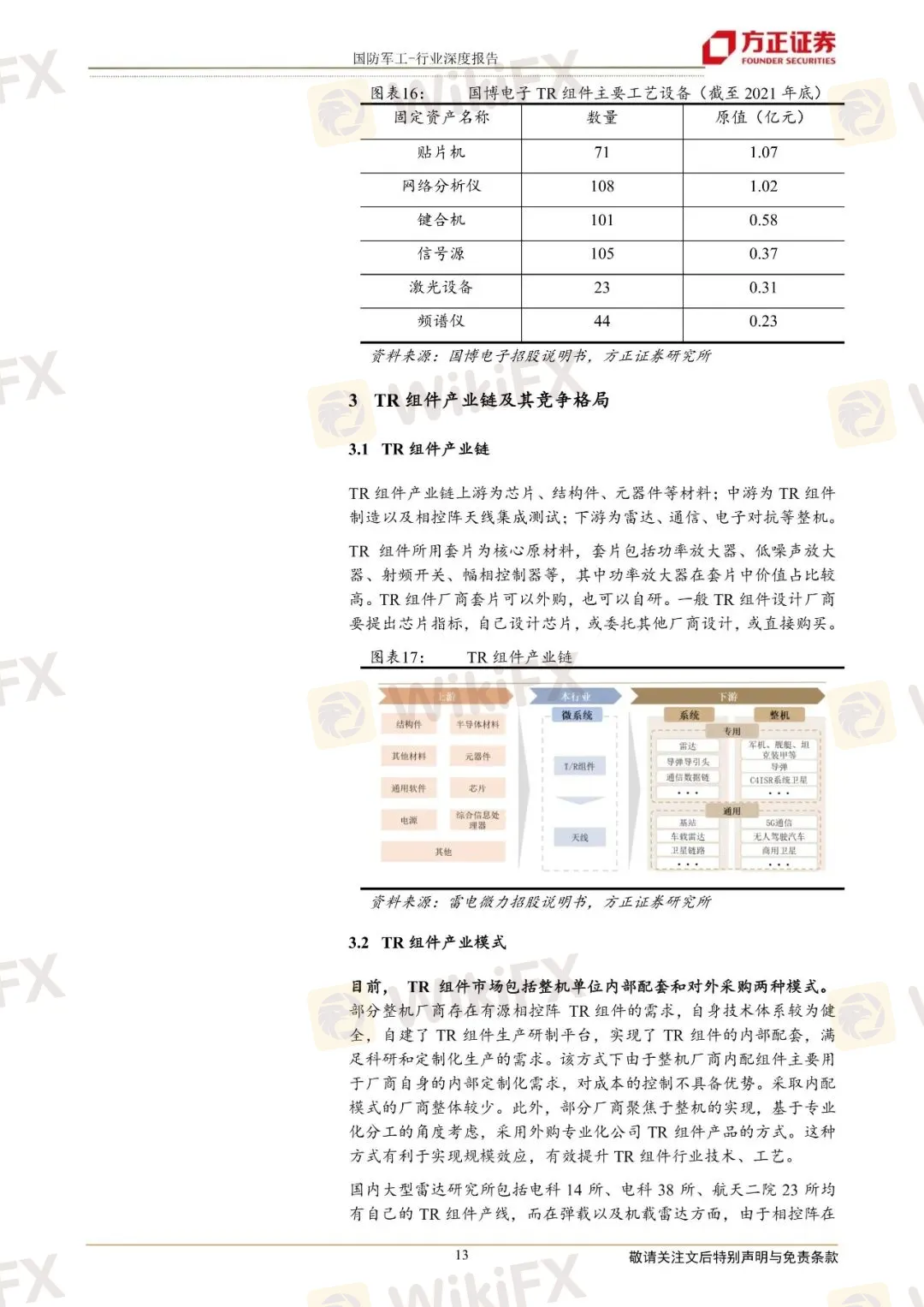 风险提示:TR组件产业竞争加剧;整机单位TR组件采购模式由对外采购变更为内部配套或更换供应商;技术革新导致传统TR组件被淘汰。