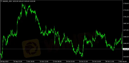 周三(11月02日),受惠于美元指数走软,现货黄金于欧亚时段持续走高。直至美国公布的10月ADP就业人数,数据显示就业人数为23.9万人,预期19.5万人,前值20.8万人,高过预期。资料公布之后,现货黄金持续走低。美联储宣布加息75个基点,并在声明中暗示可能放缓加息步伐,现货黄金短线拉升10美元,但在其后的新闻发布会中,鲍威尔表示,美联储可能最终会加息至高于9月会议上预期的水平,黄金转升为跌。现货黄金收报1634.98美元/盎司,下跌12.88美元/盎司,日内最高触及1669.23美元/盎司,最低触及1634.65美元/盎司。