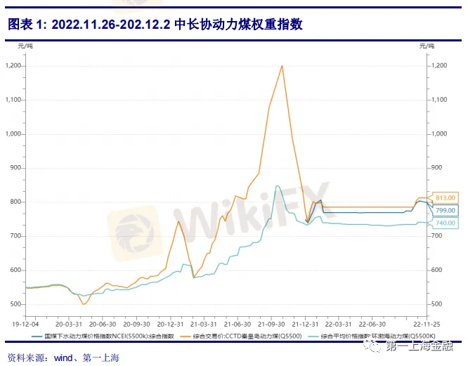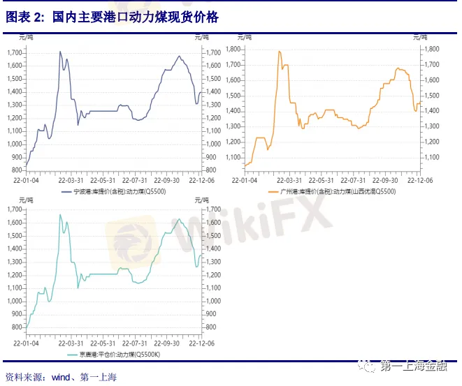 冷空气尚未影响南方地区,周发电量整体环比有所下降,11 月 30 日开始,发电量开始由降变增。11 月 25 日至 12 月 1 日,纳入统计的燃煤发电企业日均发电量,环比减少 6.4%,同比减少 8.6%。日均供热量环比增长 19.3%,同比减少 14.4%;电厂日均耗煤量环比减少 2.5%,同比减少 2.8%。日均入厂煤量环比减少 4.7%,同比减少 17.8%。受冷空气影响,北方居民供热量继续快速增加。电厂煤炭库存小幅下降,12 月 1 日,电厂库存可用天数 21.3 天,虽库存处于合理高位,但供应量下降造成库存呈下行趋势。本周寒潮来袭,全国范围内大降温,预计日耗提升速度将有所加快。气温骤降带来煤炭日耗向好预期,下游寻货积极性有所提高,北上派船采购有所增多,采购需求端迎来刚性改善。本周受疫情防控政策调整以及天气逐渐转冷的影响,下游采购意愿近期逐渐恢复,国内主要港口近日现货价格小幅反弹,未来国内现货价格有望得到支撑。