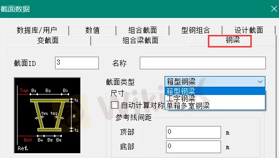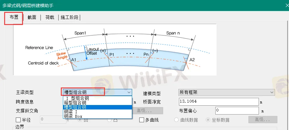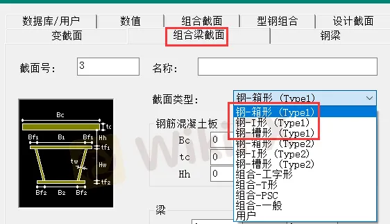 对于多梁式钢/钢混桥建模助手,支持组合梁模型中的I型组合梁、箱型组合梁、槽型组合梁(以上三种仅支持Type1型)以及钢梁中的I型钢梁、箱型钢梁(不支持单箱多室钢梁)。使用单梁式钢/钢混桥建模助手或多梁式钢/钢混桥建模助手指定截面的时候,要注意需要先在布置选项卡的主梁类型中选择与定义的截面相匹配的类型,再选择截面,否则也会出现截面定义下拉菜单中没有截面的情况。