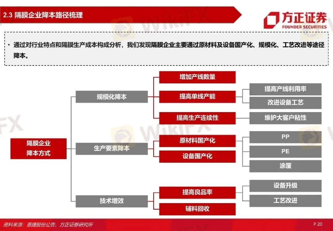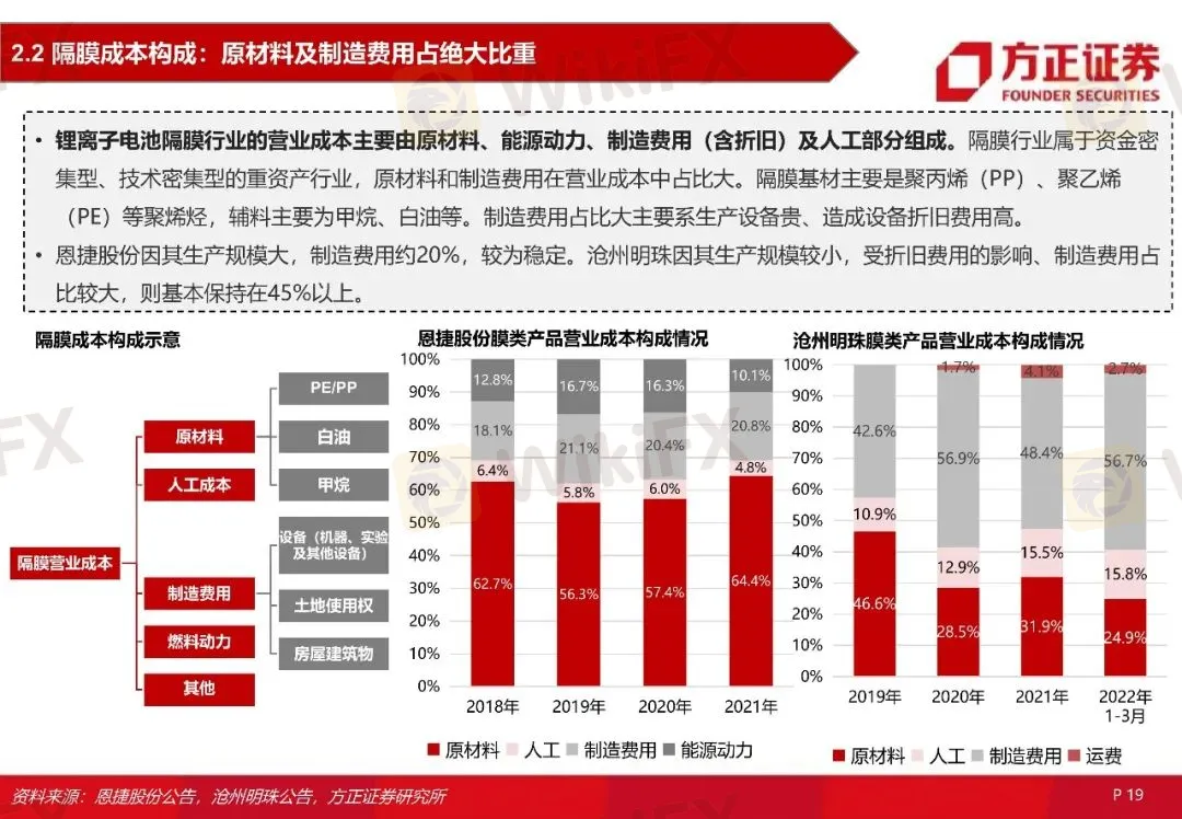 隔膜行业属于资金密集型、技术密集型的重资产行业,原材料和制造费用在营业成本中占比大。隔膜基材主要是聚丙烯(PP)、聚乙烯(PE)等聚烯烃,PE是湿法隔膜的主要原料,PP是干法隔膜的主要原料,目前原材料进口依赖度高。制造费用占比大主要系生产设备贵、造成设备折旧费用高。通过对行业特点和隔膜生产成本分析,我们发现隔膜企业主要通过原材料及设备国产化、规模化降本、工艺改进等途径降本。