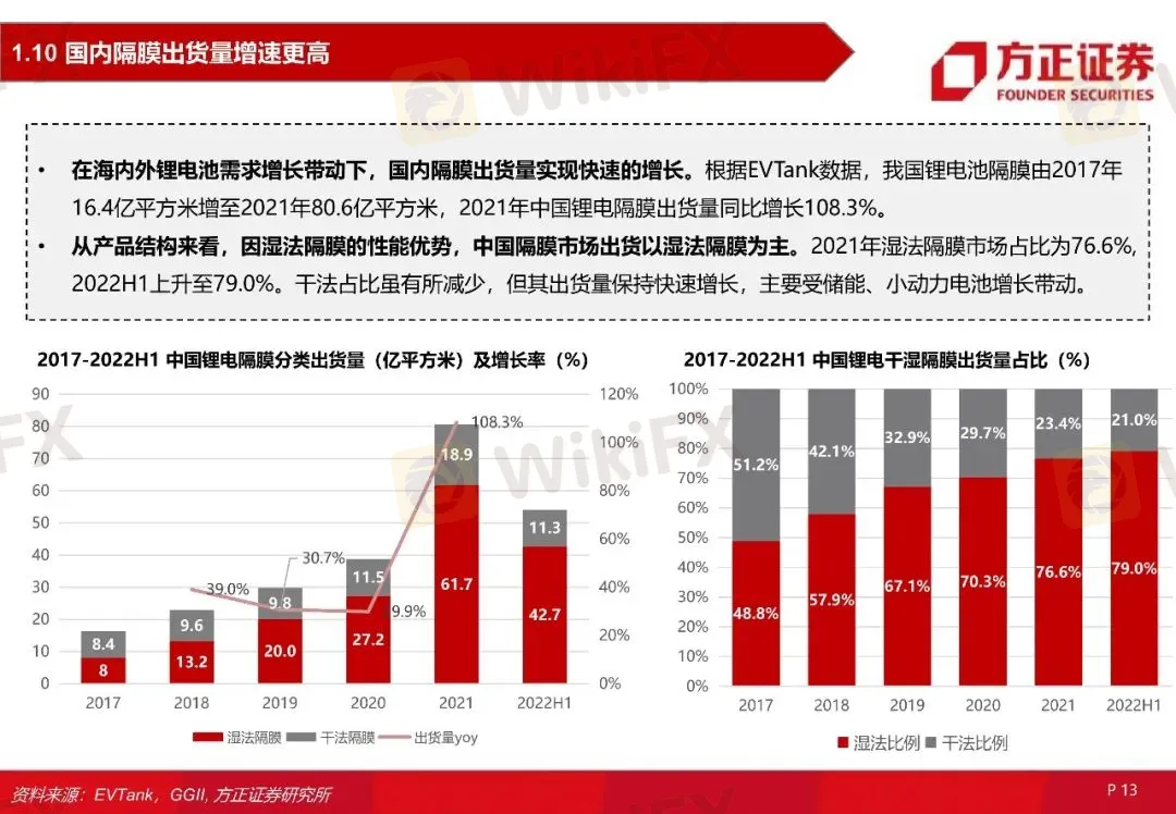 隔膜是锂离子电池的核心材料之一。隔膜的性能决定电池的界面结构、内阻等,对电池的容量、循环等产生影响。隔膜主要分为干法、湿法隔膜,湿法隔膜占比超过70%。