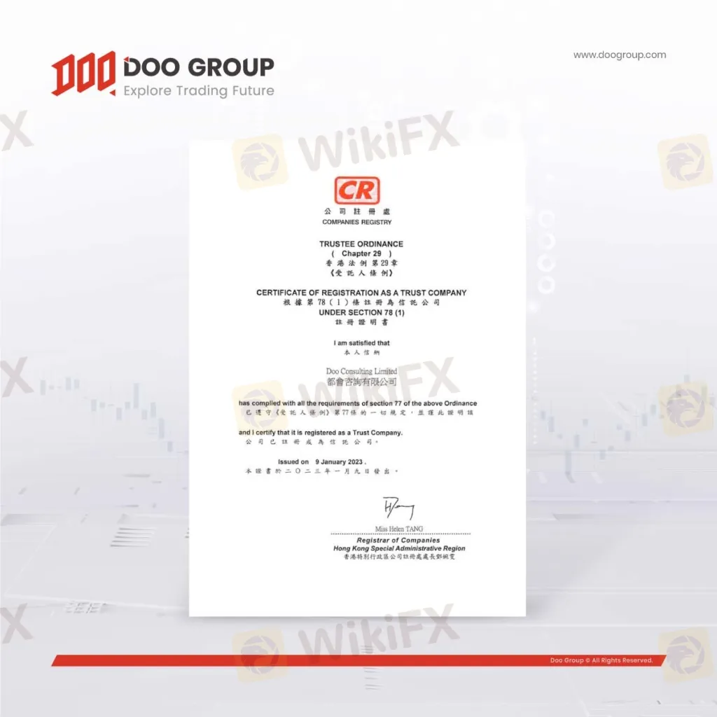Doo Group 旗下品牌 Doo Wealth 的公司 Doo Consulting Limited(“Doo Consulting”)成功向香港公司注册处申请,根据《受托人条例》(香港法例第 29 章)注册成为信托公司,这是集团发展历程的重要里程碑。公司注册处是香港财经事务及库务局辖下的部门。