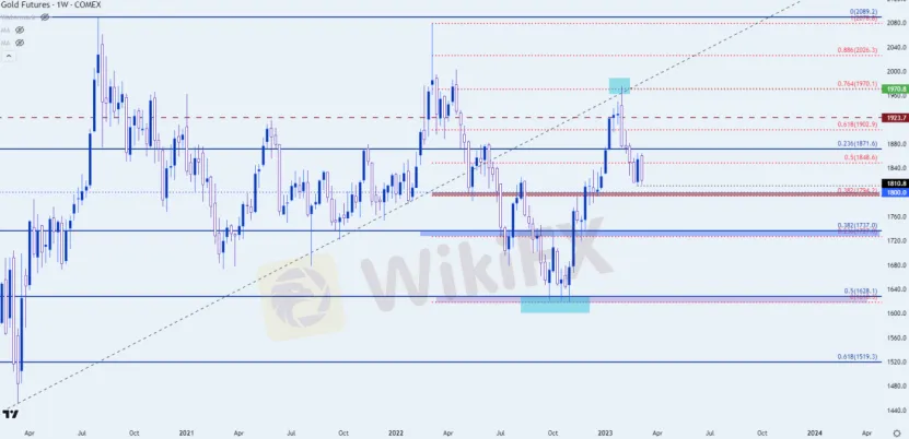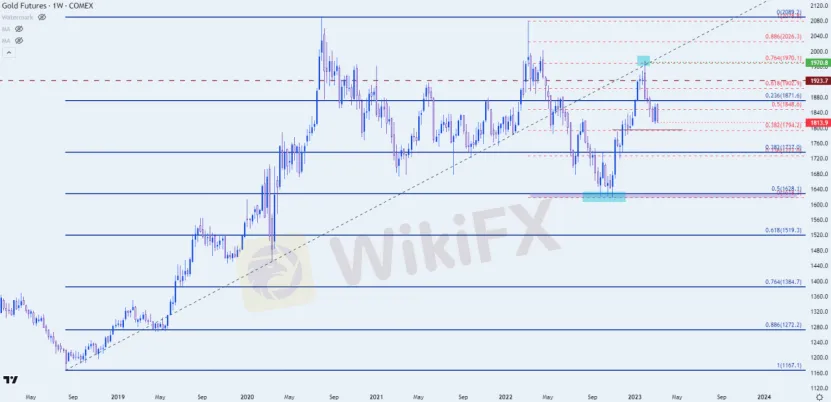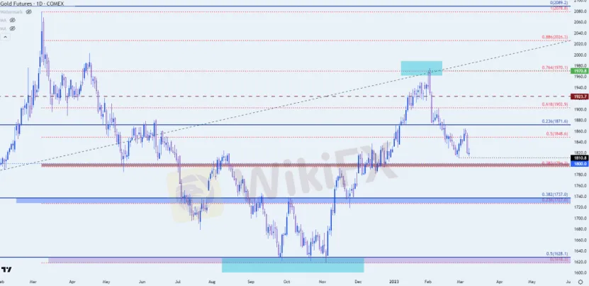 摘要:黄金要点聚焦 · 黄金目前的10个月高点1975在2月初开始发挥作用,此后空头持续对近期价格走势产生影响。 · 上周出现了看涨的吞噬形态,可能会改变走势,但现在还只是周中。 · 去年,金价再次失守2000美元之后,经历了长达6个月的困境。金价在3月份见顶,恰逢美联储这次利率上升周期中的首次加息,随着央行在夏季变得更加鹰派,金价持续下跌。