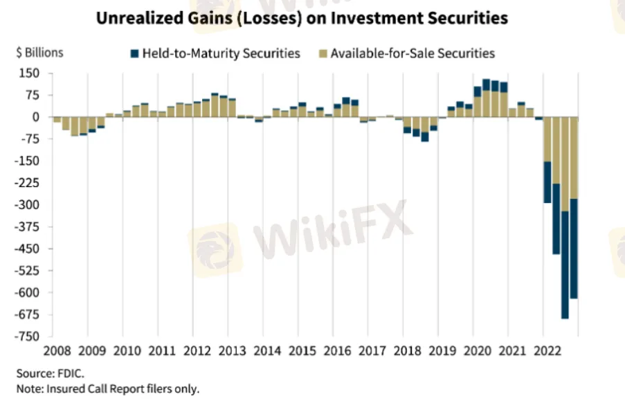 首当其冲的隐患,是整个美国银行业所持有的可供出售和持有至到期的证券中,浮亏总额已经达到6700亿美元左右。(但截至2022年第三季度,美国银行业的总资产超过23万亿美元)