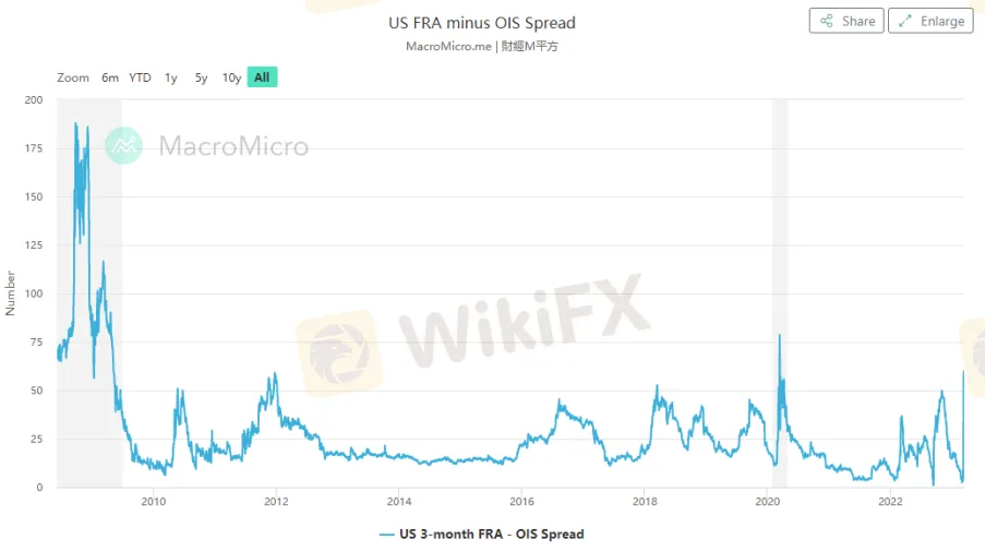 对整个金融体系来说,美国货币供应M2出现了有史以来最大的同比降幅,同时FRA-OIS利差已经明显升高,这意味着美元流动性问题正在逐渐浮出水面。