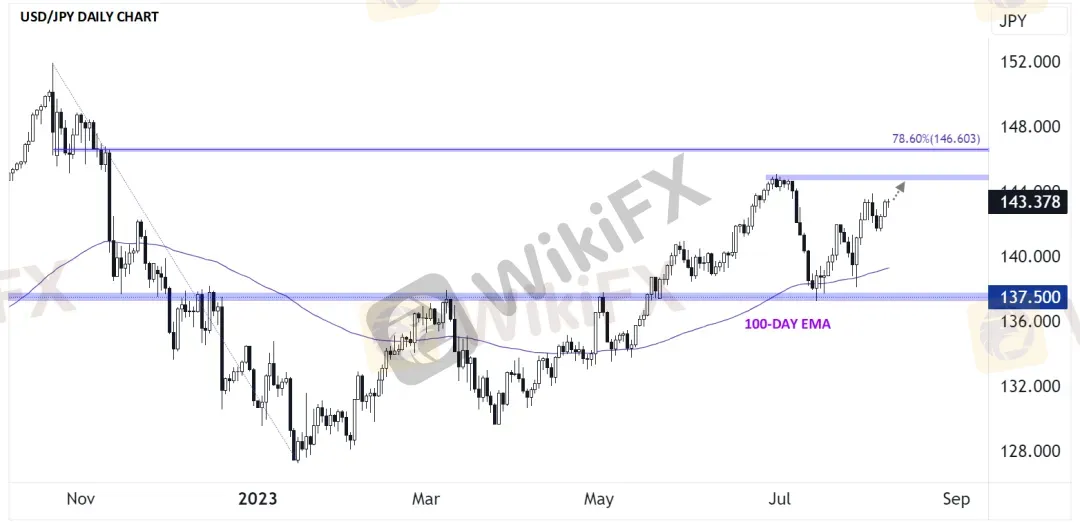 如上图所示,美元/日元交投于143.00上方,且正接近7月初的145.00高点。如果这一货币对能够超越上周的143.80高点,那么它很有可能会再次测试这一关键水平,乃至于接触从2022年10月到2023年1月的78.6%斐波那契回撤位于146.60。