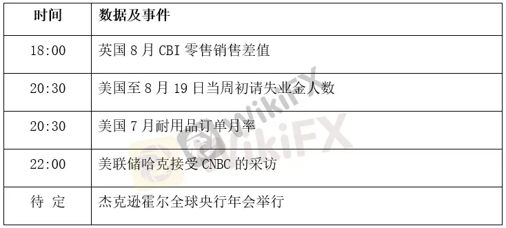 今天重点关注美国上周初请失业金人数数据,以及杰克逊霍尔央行年会开始召开,美联储主席鲍威尔预计将于周五在怀俄明州的杰克逊霍尔发表讲话,阐述对抑制通货膨胀的最后步骤,并强化其完成这项工作的承诺。投资者可密切关注讲话的内容带来的机会,或将引发大行情。
