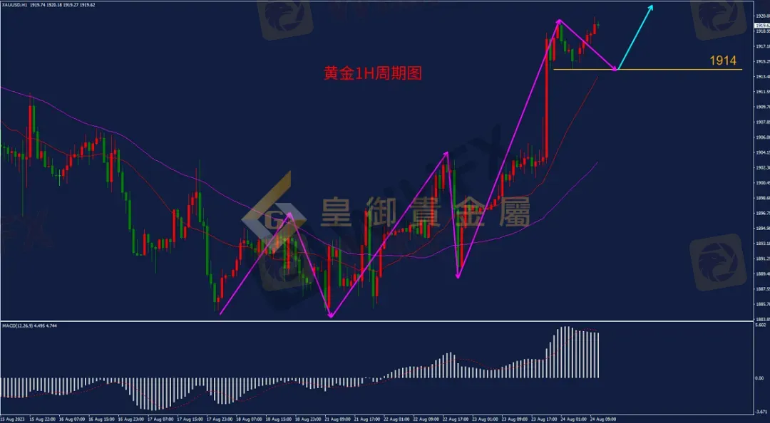 从黄金1H周期图来看,金价在1885附近形成了三重底后,并突破1904颈线阻力位,展开上涨趋势性行情,当前形态结构上低点和高点不断抬高,上涨趋势完好;从MACD动能上看,已经逐渐站上0轴上方,动能柱快速放大,并且未形态顶背离现象,说明存在再次出现高点的可能性;操作上关注下方关键支撑位1914附近,此处为昨天大涨后的调整平台,操作上建议回踩1914一线支撑后,可轻仓尝试布局多单。