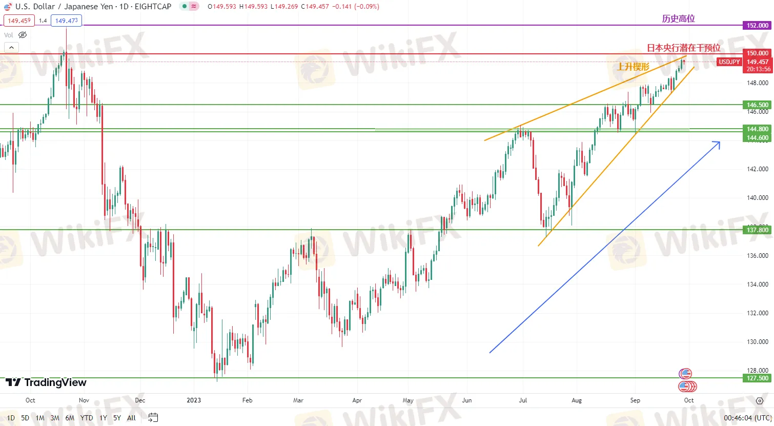 美元兑日元日线图,价格呈稳定上行趋势,交易者可考虑顺势而为。然而,价格近期有望走出“上升楔形”形态,这或许是一个高位反转信号,结合日本央行可能在150关口进行干预的市场消息,当前持有多仓的交易者可以考虑将该点位作为获利了结点,投机性空头交易者亦可考虑在该点位配合消息面进行操作。(图1)