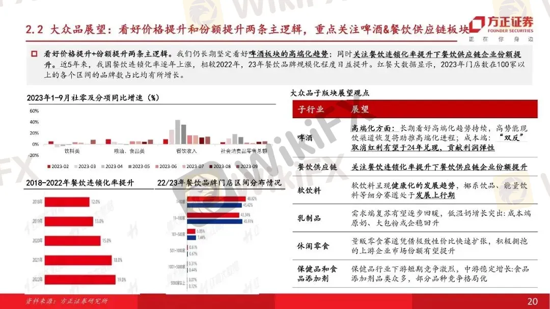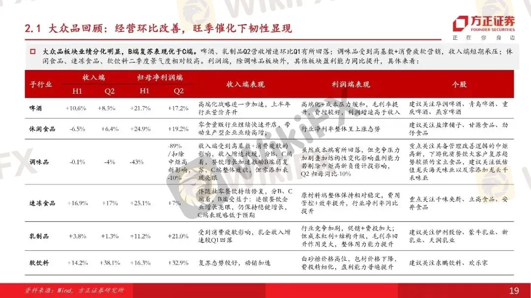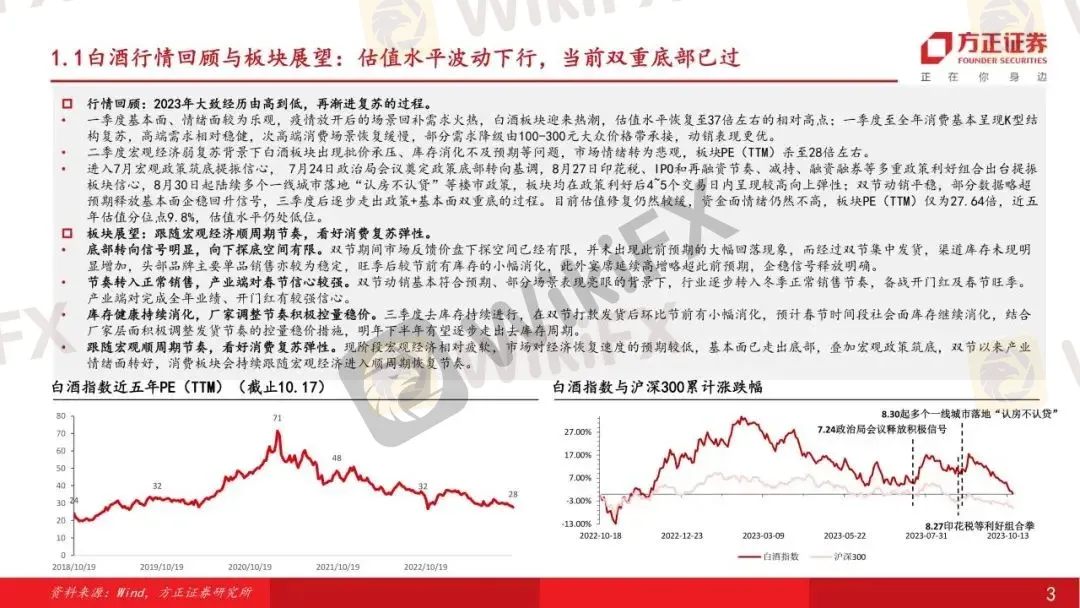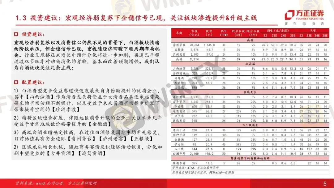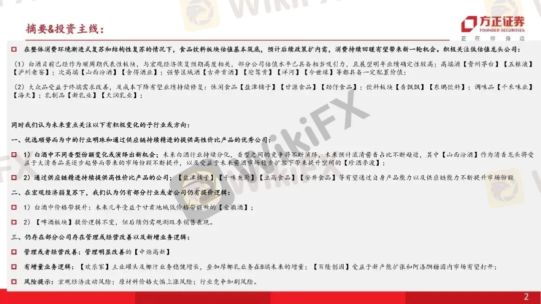 在整体消费环境渐进式复苏和结构性复苏的情况下,食品饮料板块估值基本筑底,预计后续政策扩内需,消费持续回暖有望带来新一轮机会。积极关注低估值龙头公司: