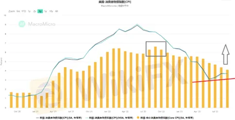 昨天美国股市和债券涨跌互现,标普500指数小幅下滑、美国10年期国债则是在4.65%附近徘徊,笔者认为这似乎又是另外一个等待行情,等待什麽呢? 就是今天晚间的CPI 物价通胀报告和明天的宏观数据。而昨天笔者提及美国核心物价指数有出现僵固或触底准备反弹的迹象,且在去年8-9月基期高的情形下,基期因素所造成的拉力逐渐消失,换句话说,笔者认为未来几个月核心物价是通胀发展趋势的关键。