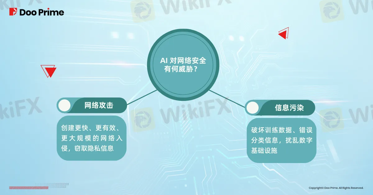 黑客可以利用 AI 定制的网络钓鱼方法或复制恶意软件来创建更快、更有效和更大规模的网络入侵,窃取隐私信息。黑客也可以借助 AI 编程能力设计、编写和执行恶意代码与指令,在数字基础设施中破坏训练数据、错误分类信息,开展新的攻击面。