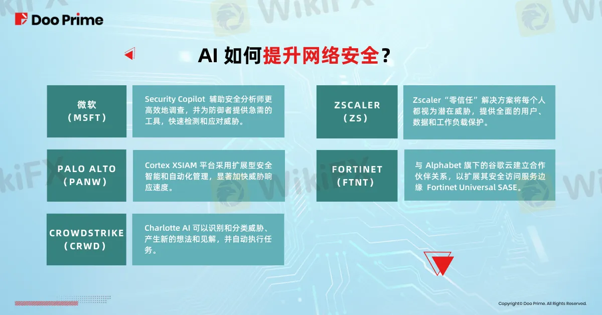 Palo Alto、Fortinet、CrowdStrike、Zscaler 已是网络安全领域的资深企业,而微软今年在注资 OpenAI 后,也正式布局 AI 网络安全。他们主要利用 AI 打破人力限制,大幅加强监测、加速应对威胁。