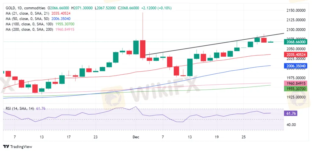 尽管前一天金价从三周高点 2089 美元回落,预计年涨幅为 14%,但金价仍有望以积极的势头结束今年。在谨慎乐观的市场情绪和美元再度疲软之后,金价在今年最后一个交易日的亚洲时段找到了需求。 投资者为年底的资金流做好准备,并避免对金价进行任何新的方向性押注,使金价处于 2070 美元左右的上行盘整阶段。未来一天,风险情绪、美元价格走势和获利了结可能会对金价产生重大影响,因为交易者在新年周末延长之前转为观望。
