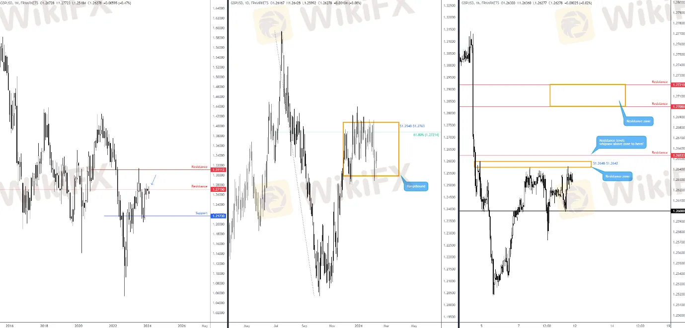 首先来看月线图表,货币对继续测试1.2715美元的阻力,连续第二周微幅收低。总体长期走势呈现下跌趋势,自2022年9月1.0539美元的历史低点反弹后,仍可视为长期的反弹抛售情景。我们是否会看到1.0539美元甚至更低的低点在可预见的将来出现还有待讨论,但事实是我们的走势是向南方向,并且价格正在逐渐逼近月线阻力。因此,未来几个月可能需要关注1.2173美元的支撑位。