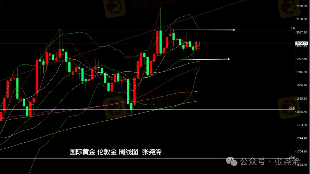 周线级别:金价上周延续前周触底回升之力,反弹收涨,稳于中轨上方,且在布林带趋向缩口横向运行之际,这暗示后市将有望展开上行发展,但附图指标MACD仍维持空头信号发展,仍有再度转跌的风险,故此暂时继续关注2075-1980美元形成的区间行情,在此之内继续震荡对待,突破或者是跌破,都将产生延续性行情,跟进即可。