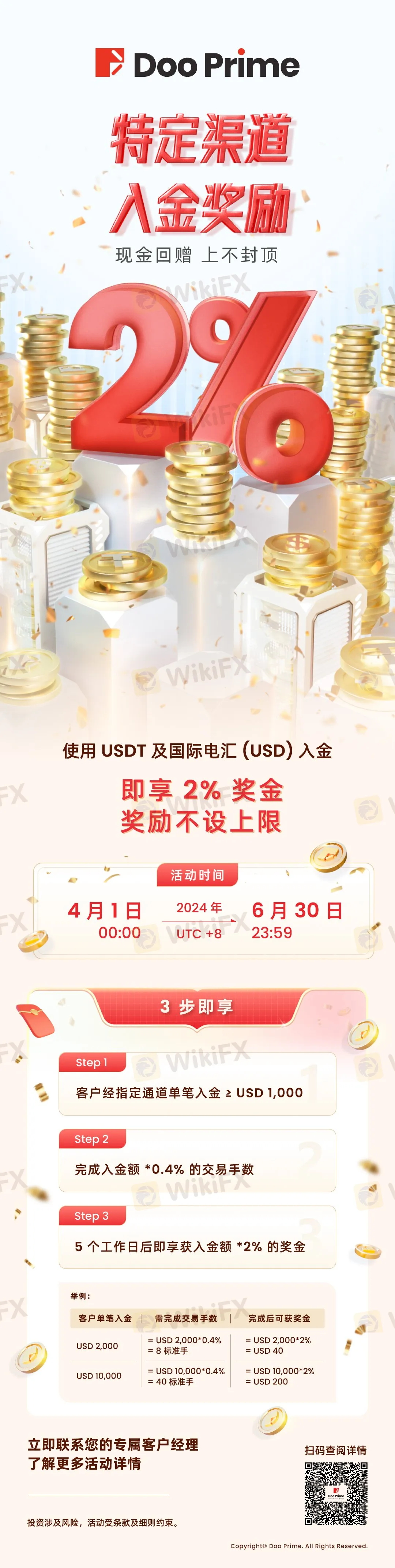 您只需在 2024 年 4 月 1 日 – 6 月 30 日 (UTC+8)期间完成通过指定渠道完成单次入金 USD 1,000 或以上,即可享受高达 2%的入金回馈,入金越多,回赠越多,上不封顶,把握机会让您的财富迅速增值!