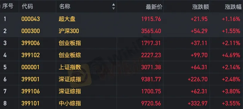 三大指数高开高走,尾盘集体涨超2%,微盘股指数大涨近10%,全市场逾千股涨超9%。