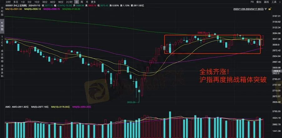 沪指再度反弹,会到箱体突破口位置。整体而言,一季度GDP数据超预期,对市场整体上形成支撑。但目前沪指虽然收在3000点上方,但距离3000点已经很近,后续或将打响3000点保卫战,后续需紧密关注 3000 点区域的得失情况。