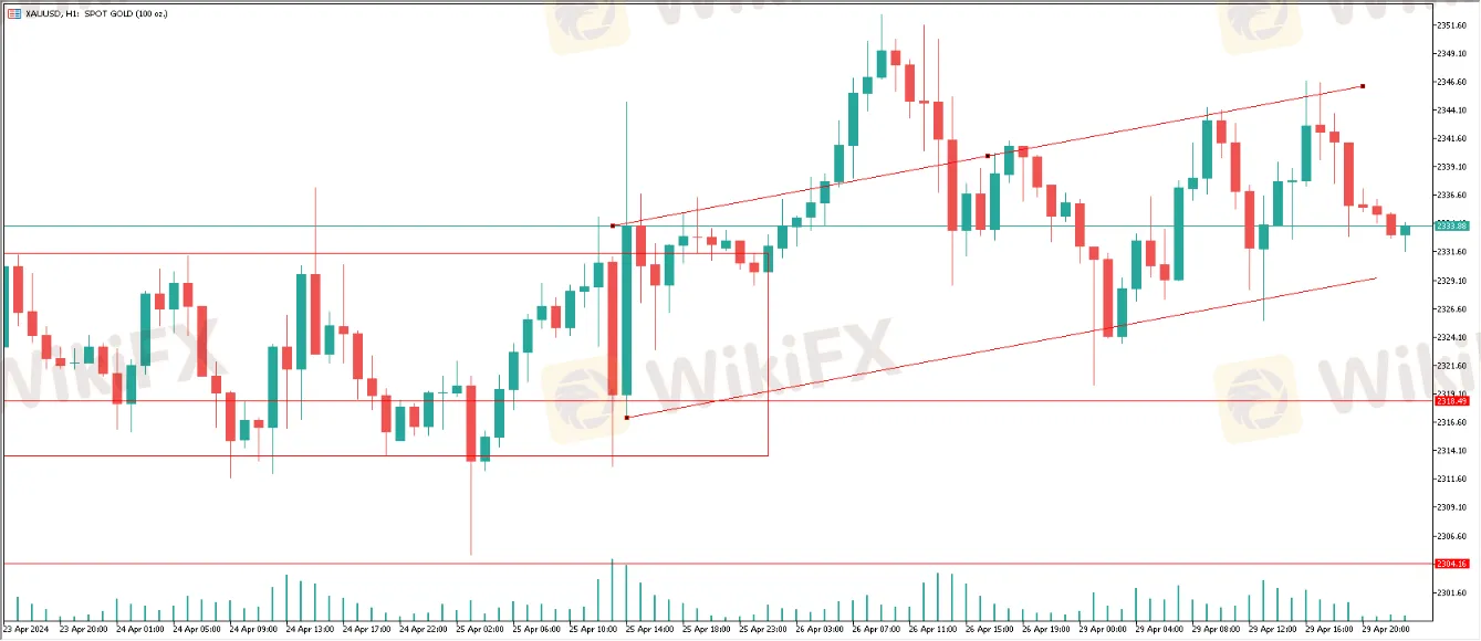 技术方面,黄金1小时线可以看出走势在范围内窄幅震荡,早些时候下探至第一阻力位2295附近后回升至2313-2353之间。由图可见黄金在波段方面已经形成较为平稳的走势,不过整体还是有上行突破的可能。