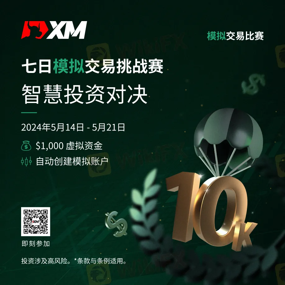 2024年05月14日至05月21日期间,报名参加XM模拟交易比赛,挑战自我,制定交易策略,瓜分总值 $10,000 美元现金奖励!