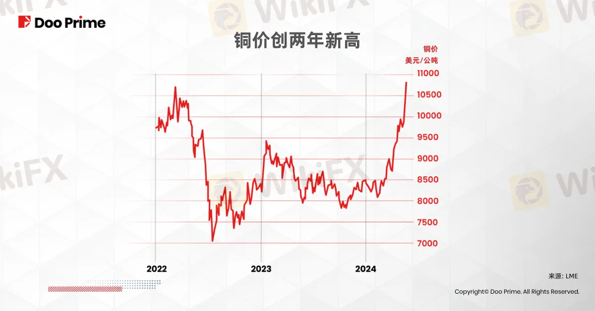 正因供需失衡,自 2023 年底以来,铜价一直处于上涨趋势。自 2024 年 2 月中旬以来,由于铜矿短缺,铜价已飙升逾 20%,达到每吨近 1 万美元的两年高点。