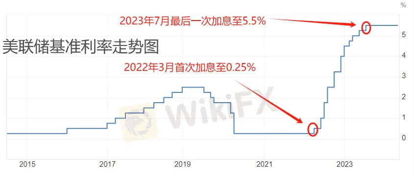 ATFX金属:2022年3月,疫情冲击消退,美联储急于恢复常态化货币政策,启动两年来的首次加息,将基准利率从0%推高至0.25%。2023年7月,美国高通胀问题得到显著抑制,继续升高利率的必要性消失,美联储最后一次加息后停止了激进加息政策,最终基准利率落在5.5%高位。货币政策角度分析,加息能够增强本币吸引力,有利于美元指数升值,对黄金白银、美债价格、非美货币形成显著冲击。