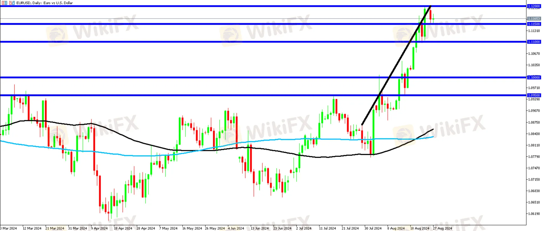消息公布后,欧元兑美元从上升趋势线回撤,可能会回调至1.11。如果价格回调至1.11,可能会继续其近期的看涨趋势,测试2023年7月的1.1250区域,该区域曾是一个重要的供应区。