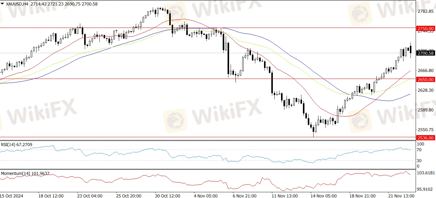 黄金涨势预计将延续,价格可能再次挑战2750美元关口。上周黄金突破了50日简单移动平均线(SMA)2663美元后,买家推动现货价格进一步上升。如果价格突破2750美元,下一个目标将是2790美元的历史高点。突破这一水平可能推动金价升至2800美元,并为挑战3000美元的阻力位奠定基础,后者被高盛视为下一主要阻力位。下行方面,如果黄金跌破2700美元,可能在2650美元至2700美元之间区间震荡。但如果空头将价格压低至11月14日低点2536美元以下,并进一步跌破2500美元,可能引发更多下降。相对强弱指数(RSI)已经转为看涨,表明买方目前占据主导地位。
