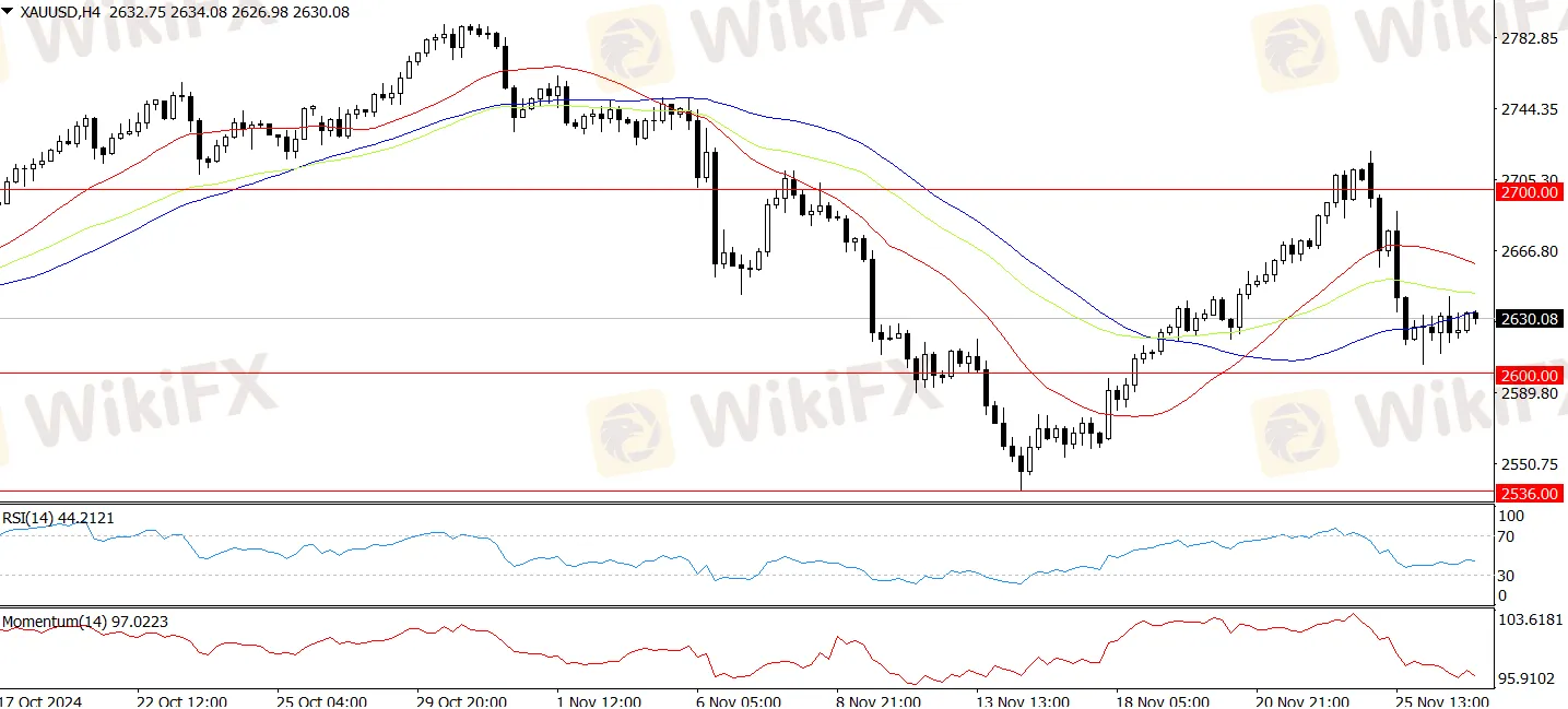 摘要:产品:XAU/USD预测:下降基本分析:现货黄金在触及一周低点约2,605美元/盎司后大幅反弹,收于2,630美元以上。分析师指出,尽管以色列与黎巴嫩达成停火协议减少了避险需求,但对俄乌战争和特朗普关税计划的担忧支撑了金价的回升。周二,现货黄金上升约0.3%,收于2,632.67美元/盎司,此前曾跌至2,605.15美元,为11月18日以来最低水平。尽管中东地区传出停火消息,但金价仍有所上升。以色