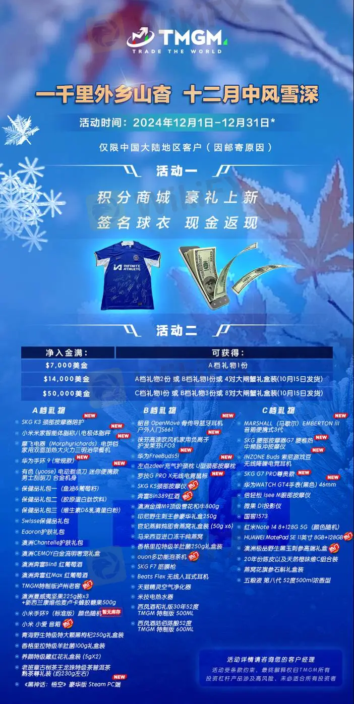 在这样一个充满机遇的时期,TMGM希望通过12月入金送礼活动,帮助您更好地把握市场机会。通过参与此次活动,您可以充分利用圣诞行情带来的波动,同时享受我们精心准备的礼物。