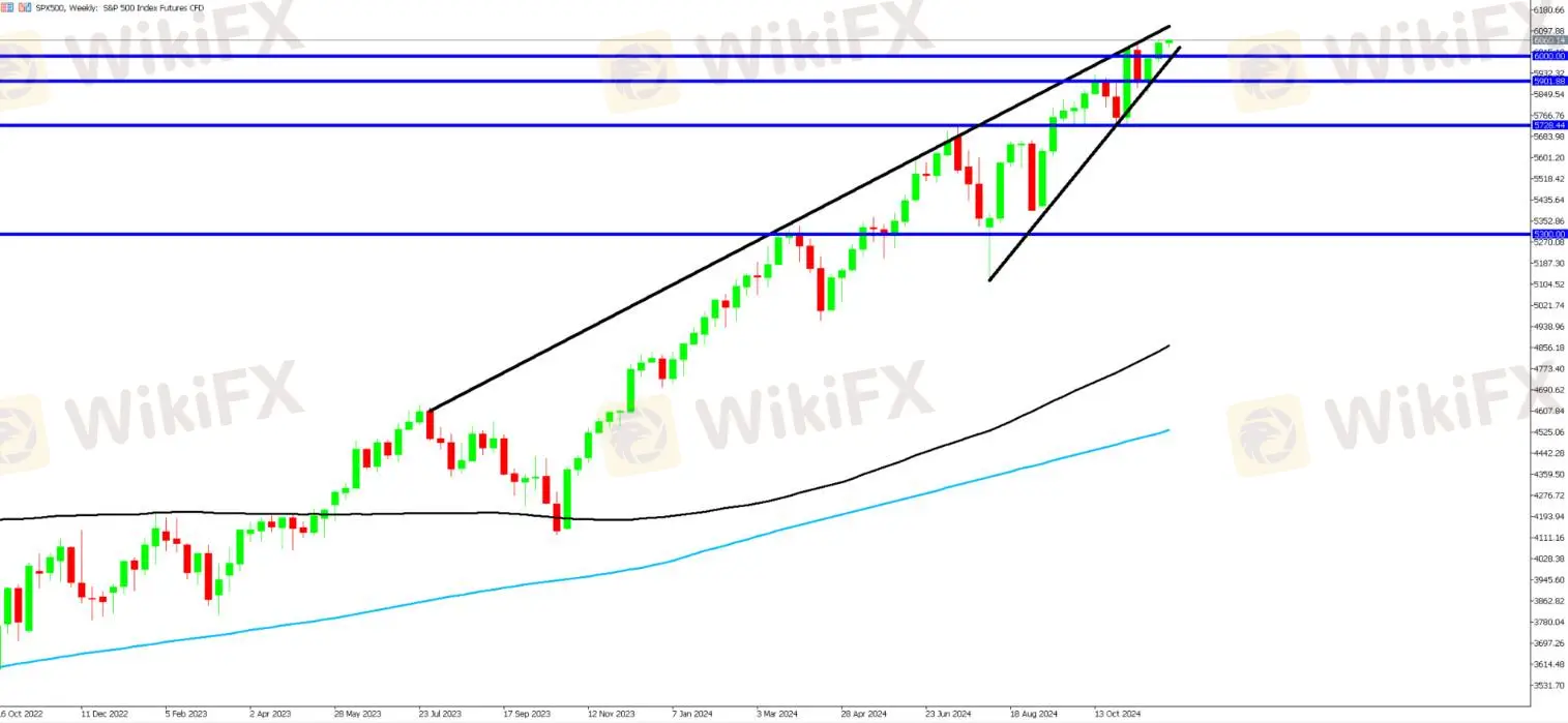 消息发布后,SPX500指数继续攀升,达到历史新高,突破6000点。价格受到上升趋势线的支撑,但可能很快会遇到上升趋势线上沿的阻力。