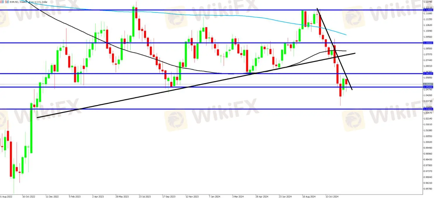 欧元兑美元(EURUSD)自10月初以来继续大幅下跌,目前价格再次测试1.05的支撑点。价格可能继续下行,同时测试下降趋势线的阻力。
