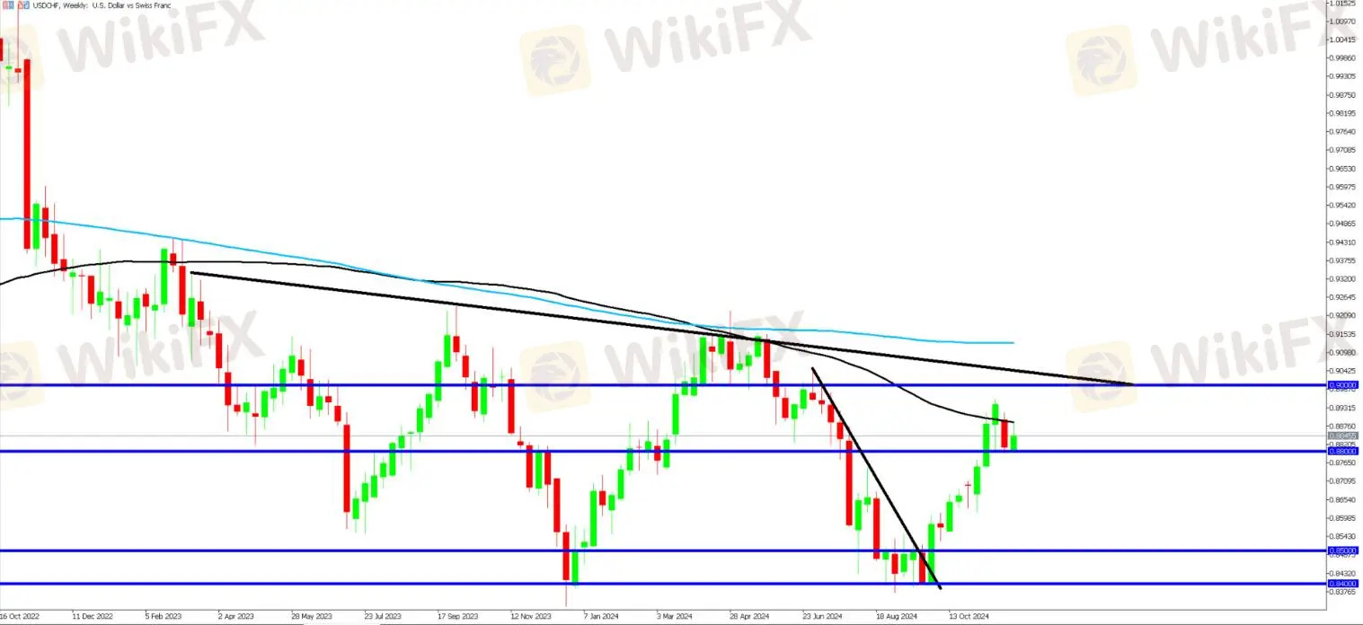 数据公布后,美元兑瑞郎从0.88反弹,并测试100日移动均线(黑线)阻力。如果价格继续攀升,可能在0.9的关键点遇到阻力,该点与下降趋势线相交。