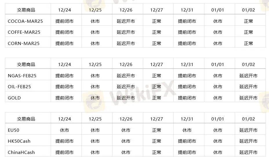 由于公共假日即将到来,部分商品的交易时间将于2024年12月24日 – 2025年1月2日期间受到影响。