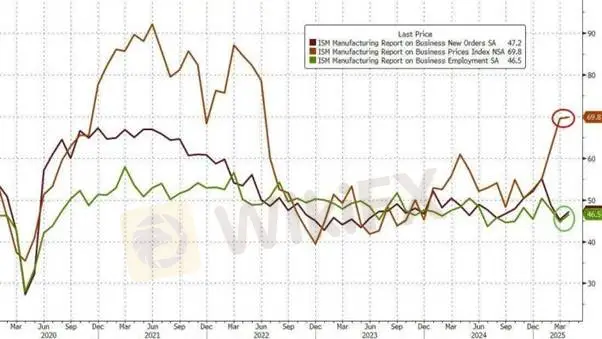 摘要:一、数据驱动:制造业与劳动力市场的信号分化周四公布的美国首次申请失业救济人数下降,推动两年期美债收益率一度刷新三周新低。但随后发布的ISM制造业PMI数据略高于预期(48.7,预期47.9),市场短线解读偏鹰,导致收益率回升超10个基点,美元指数则连涨三日,重返100关口上方。【美国4月ISM制造业PMI 图片来源:ZEROHEDGE】尽管PMI好于预期,但细项显示,制造业扩张仍面临结构性压力。受