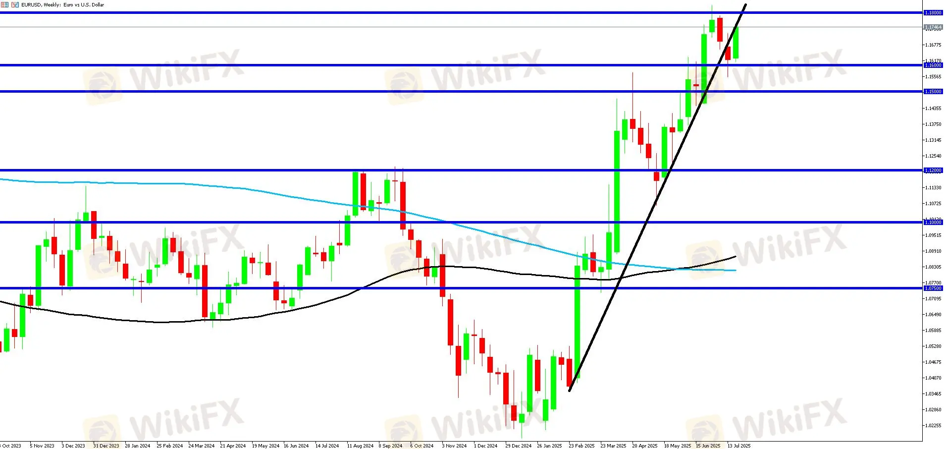 鲍威尔讲话后,欧元兑美元(EURUSD)迅速上涨,并回调至上升趋势线附近。当前价格正接近1.18附近的波段高点阻力区,该点位与上升趋势线的回调重合。