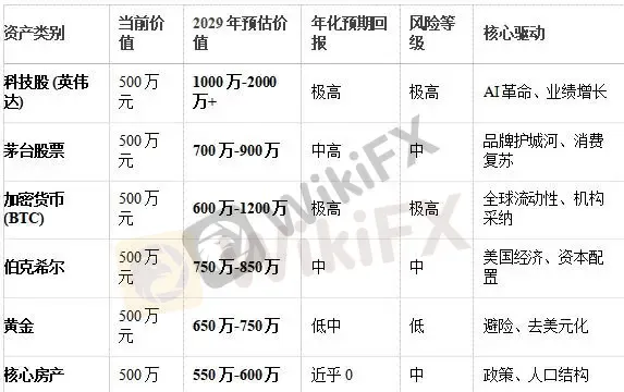5年后,最具增值潜力的资产很可能在代表未来生产力的“科技股”(英伟达)和代表新型储值工具的“加密货币”(比特币)中诞生,但二者都伴随着极高的波动性和不确定性。茅台股票作为传统核心资产,有望实现稳健增值。