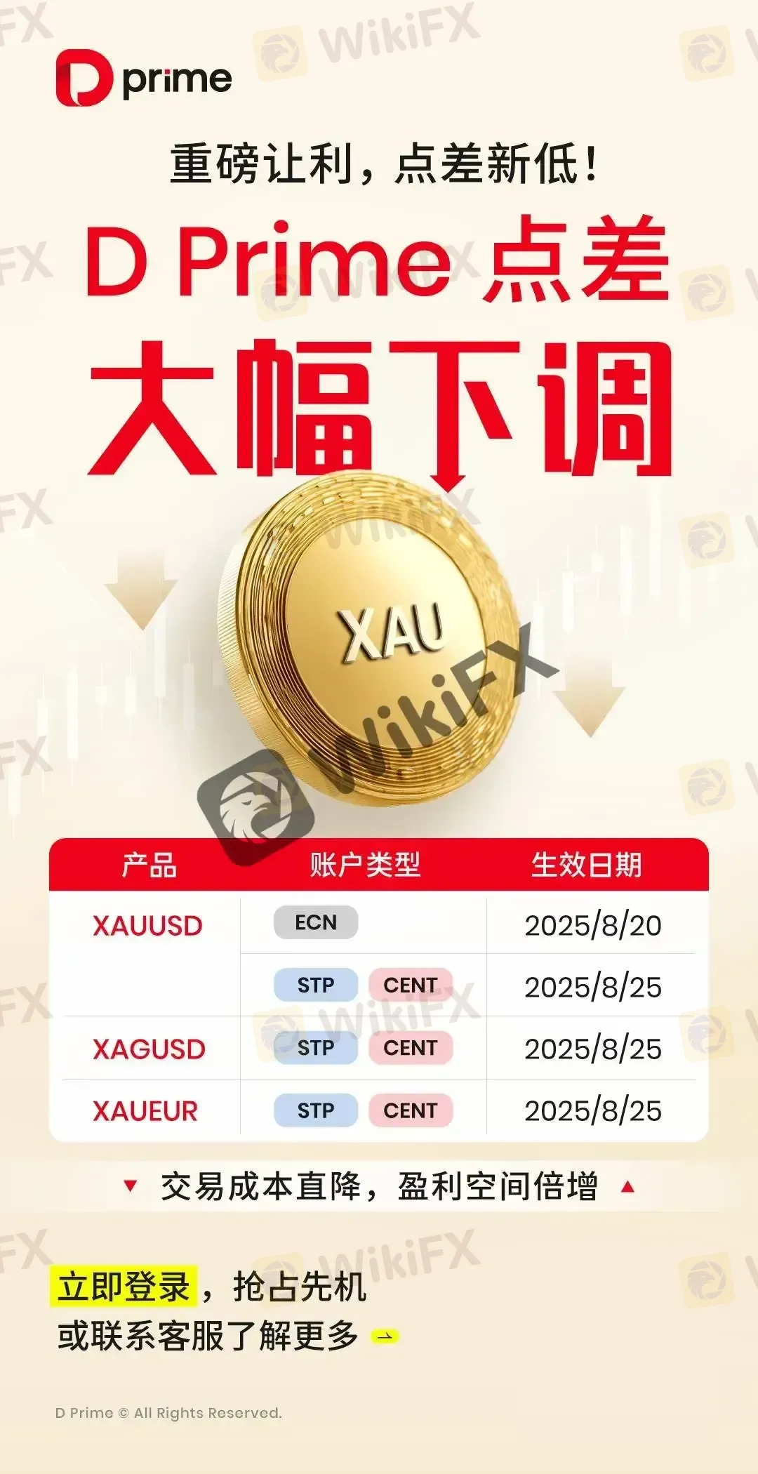 为全面提升 D Prime 在全球市场的竞争力,从 2025 年 8 月 20 日起,D Prime 将陆续下调 ECN﹑STP 和 Cent 账户 XAUUSD 等产品的点差。