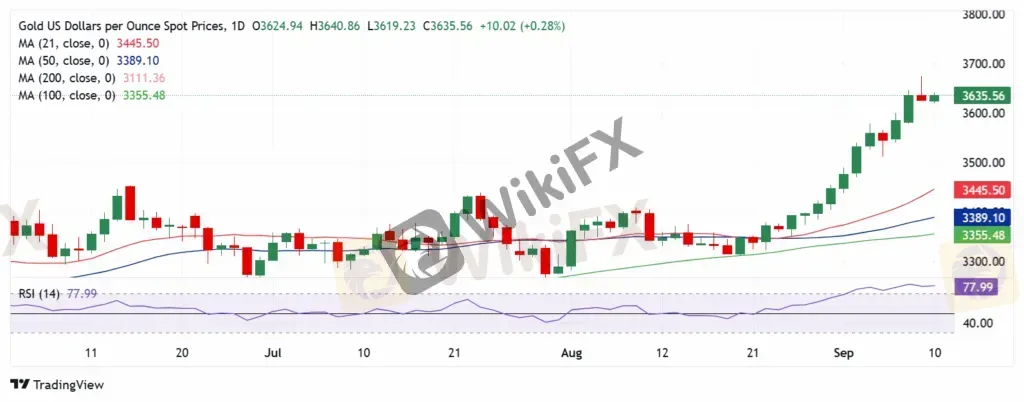 日线图显示,由于 14 天 RSI 仍处于严重超买区域,黄金可能会再次从高位回落。该领先指标目前接近 78。如果黄金买家失守,直接支撑位在 $3,600 整数点位,跌破后可能会测试本周低点 $3,578。