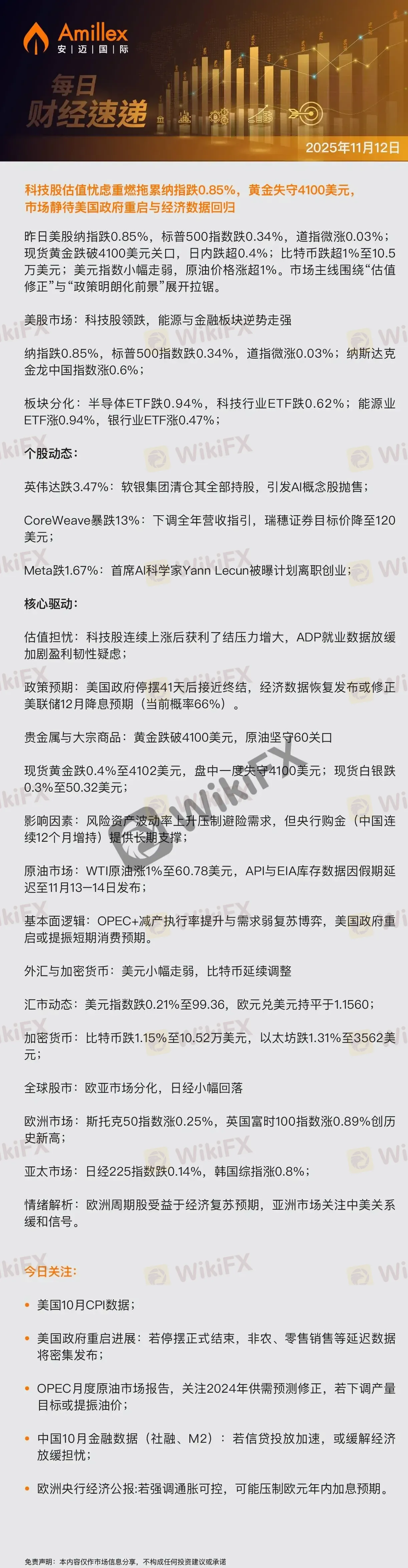 科技股估值忧虑重燃拖累纳指跌0.85%,黄金失守4100美元,市场静待美国政府重启与经济数据回归