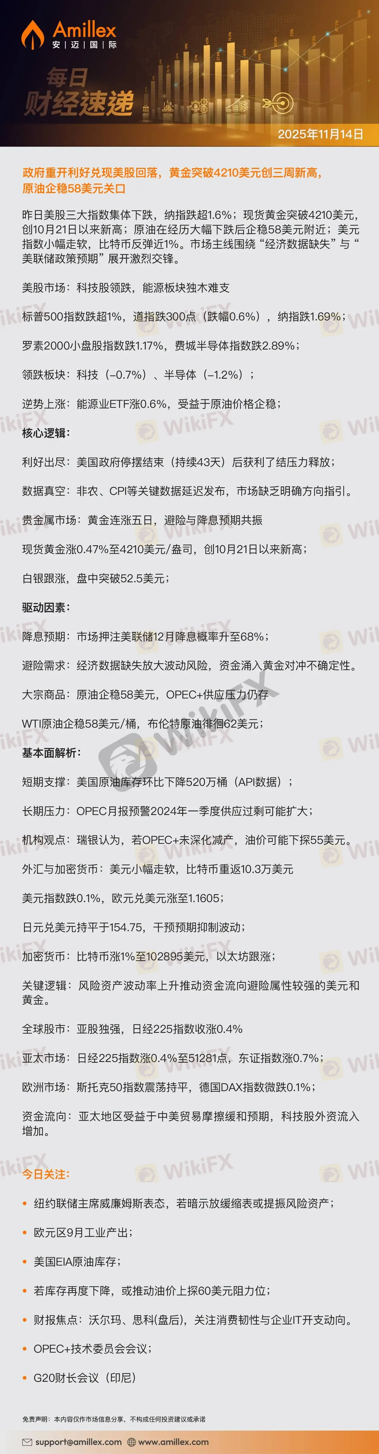 Amillex每日汇评:政府重开利好兑现美股回落,黄金突破4210美元创三周新高,原油企稳58美元关口